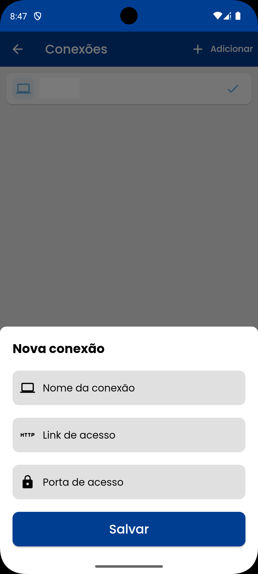 Para cadastrar uma nova conexão, no canto superior direito da tela, clique no botão + Adicionar. No modal de cadastro, digite o nome da empresa a qual faz parte (sem pontos e acentos), espere o app puxar as informações do servidor, e depois clique em Salvar.