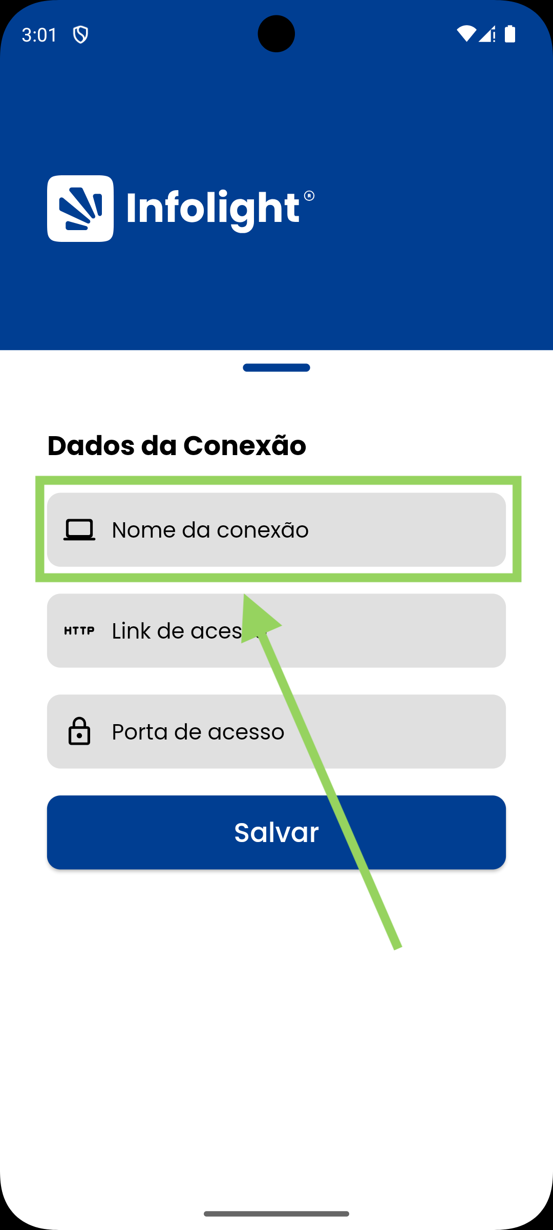 nome da conexão, informe o nome(sem acentos e pontos) da empresa a qual você faz parte. Baseado no nome que o usuário informar, o aplicativo preencherá automaticamente olinke aportade acesso. - Clique no botão