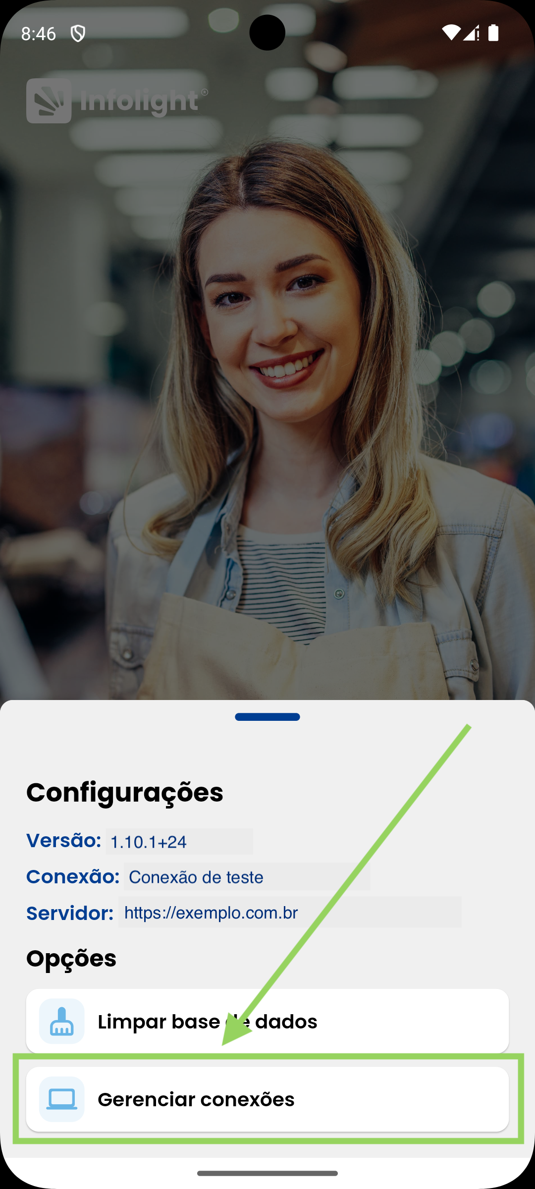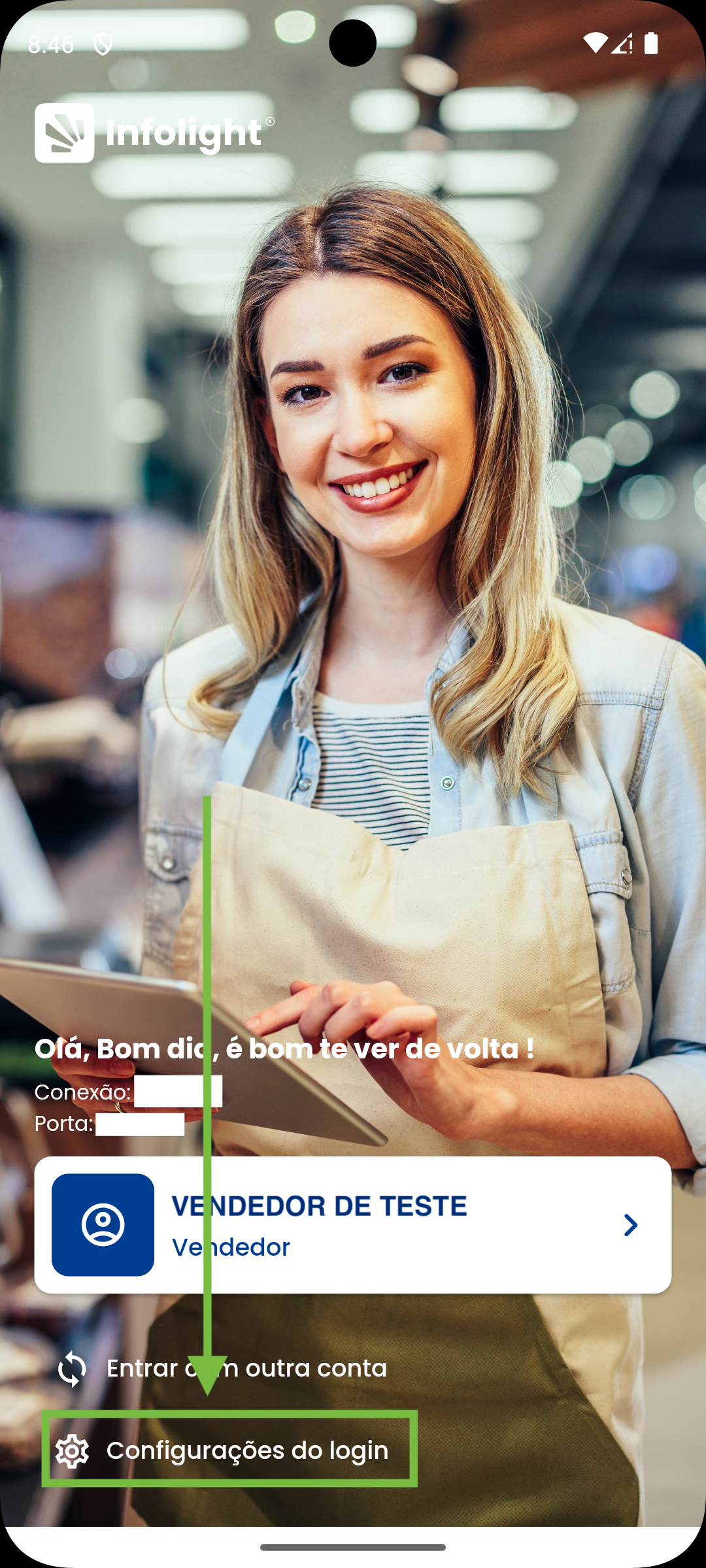 A conexão ativa também é exibida na tela de login e nas configurações de login.