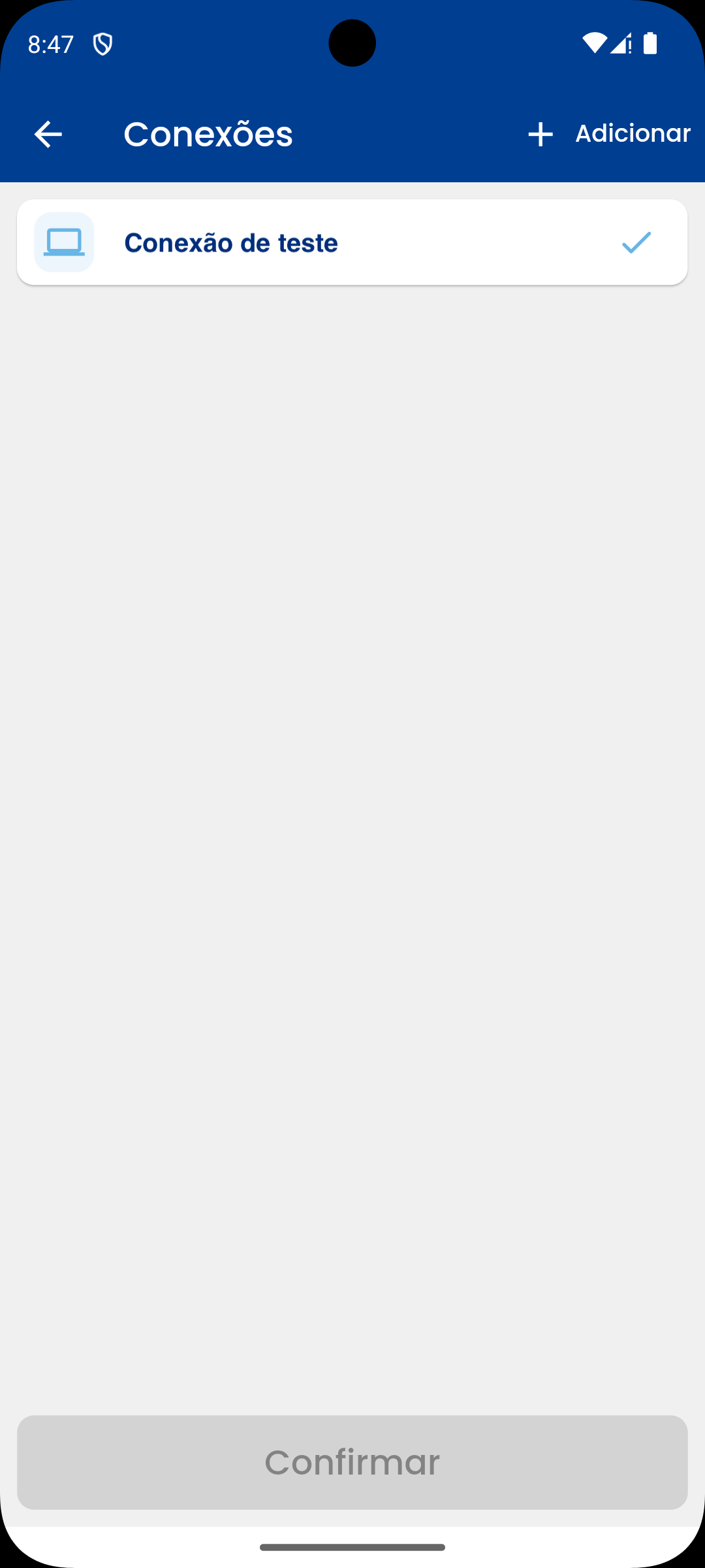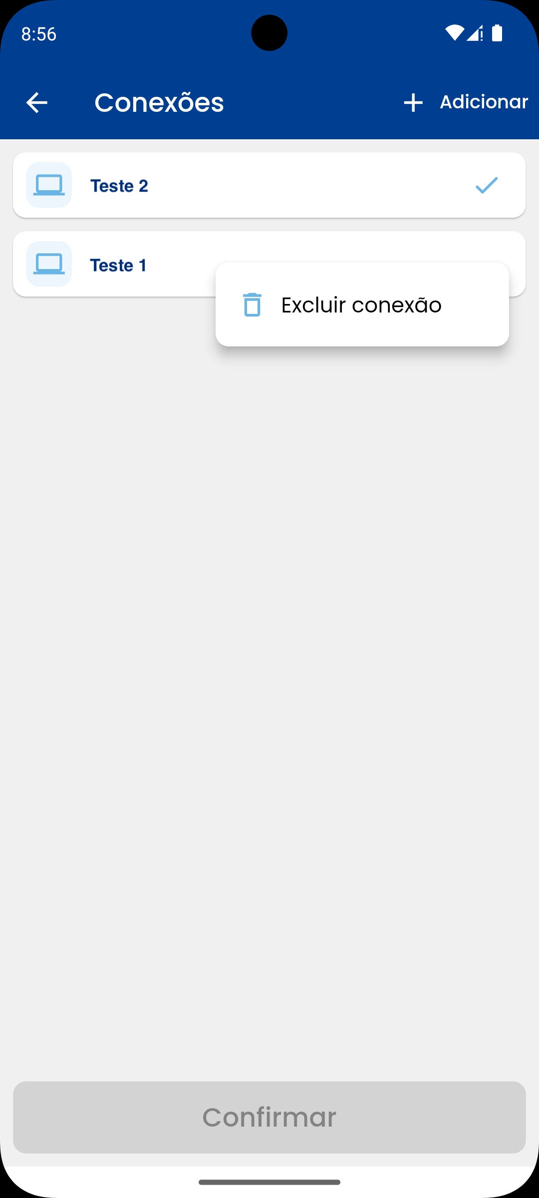 Ao cadastrar uma nova conexão, ela será automaticamente listada na tela. Selecione a conexão cadastrada e clique em Confirmar.