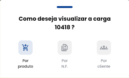 Ao tocar no card que representa a carga, é exibido logo abaixo um modal de seleção de visualização. Nele, o usuário pode escolher visualizar a carga por Produto, Nota Fiscal (N.F.) ou Cliente.