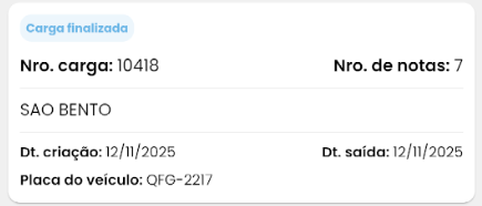 O card da carga finalizada passa a ser a identificada pela legenda Carga finalizada, exibida no canto superior esquerdo do card.