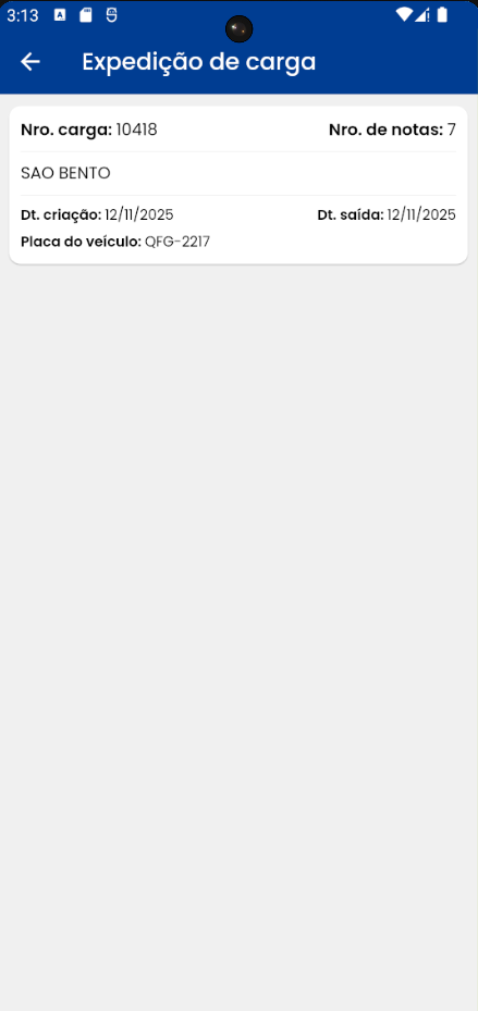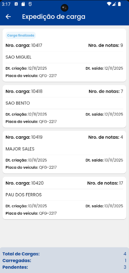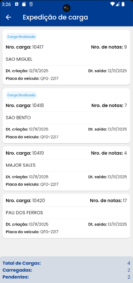 Após a conferência de todos os produtos, o botão Finalizar Carga é habilitado. Com conexão ativa à internet, ao tocar nele o processo de expedição é concluído com sucesso. Após a finalização, o aplicativo retorna o usuário para a tela de Expedição de Carga, onde a carga finalizada é exibida no topo da lista.