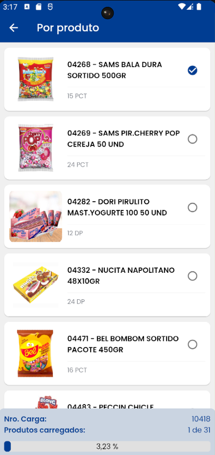 Na parte inferior da tela, são exibidos o número da Carga, a quantidade de produtos já carregados e uma barra de progresso com a porcentagem do carregamento.