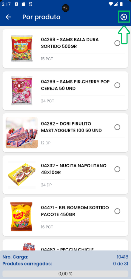 No cabeçalho da tela, no canto superior direito, há o ícone para cancelar o carregamento da carga.