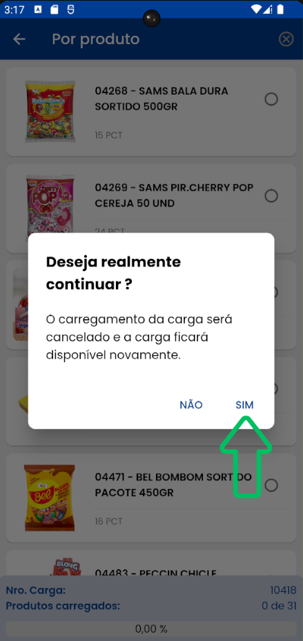 Caso o usuário feche a tela ou o aplicativo durante a expedição, ao voltar a abrir a carga selecionada, o sistema retoma automaticamente o progresso do carregamento exatamente do ponto em que parou — mantendo os produtos já conferidos marcados e o restante pendente.