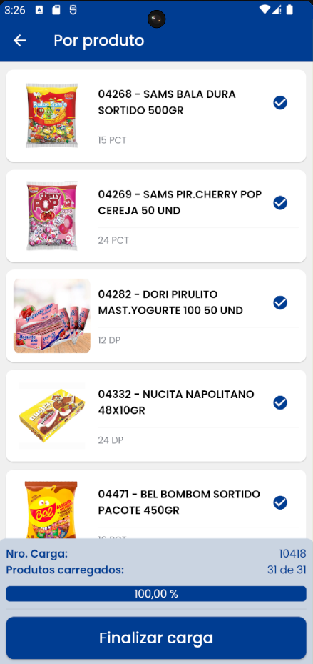 Quando atinge 100%, o botão Finalizar Carga é habilitado.