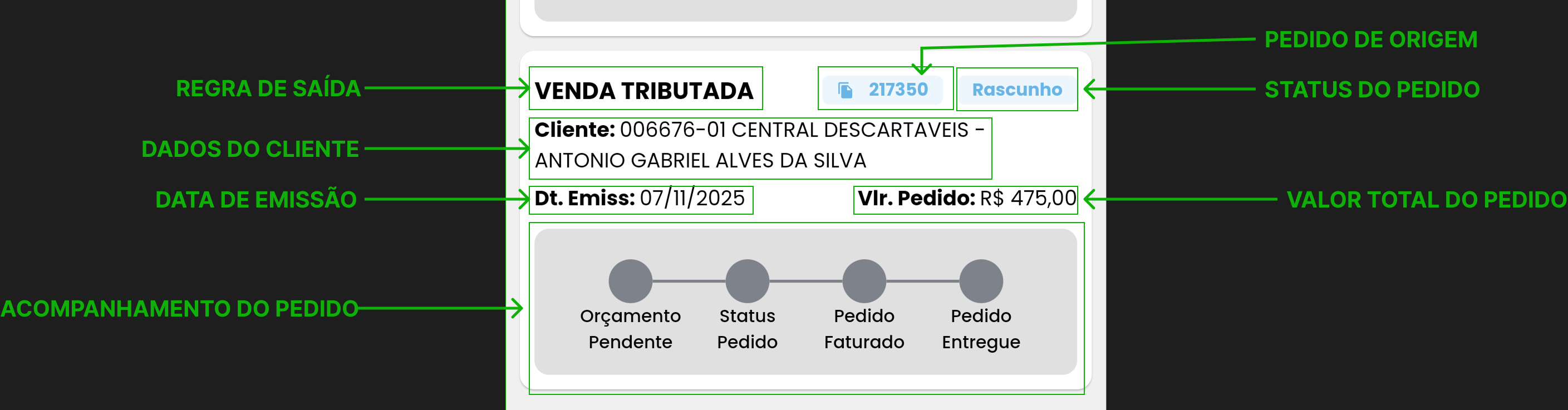 A listagem de pedidos nas duas guias é feita no formato de cards, que contém as seguintes informações: