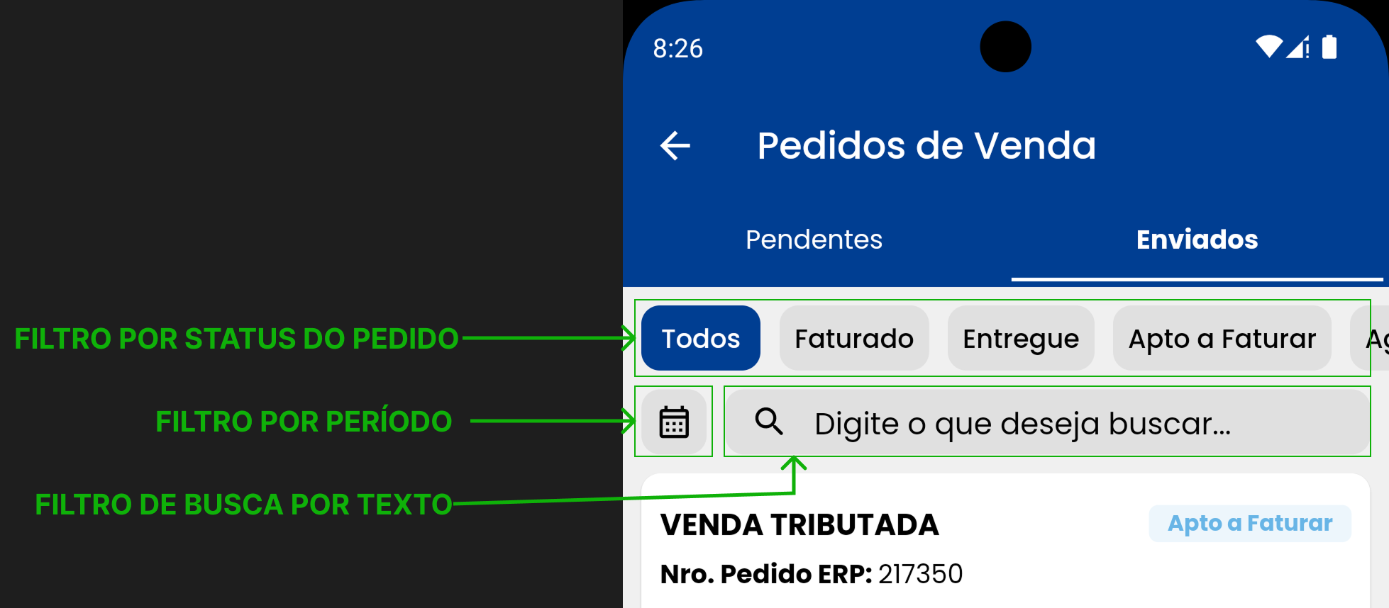 Este filtro permite exibir os pedidos com um status especifico, por exemplo: pedidos com o status de faturado.