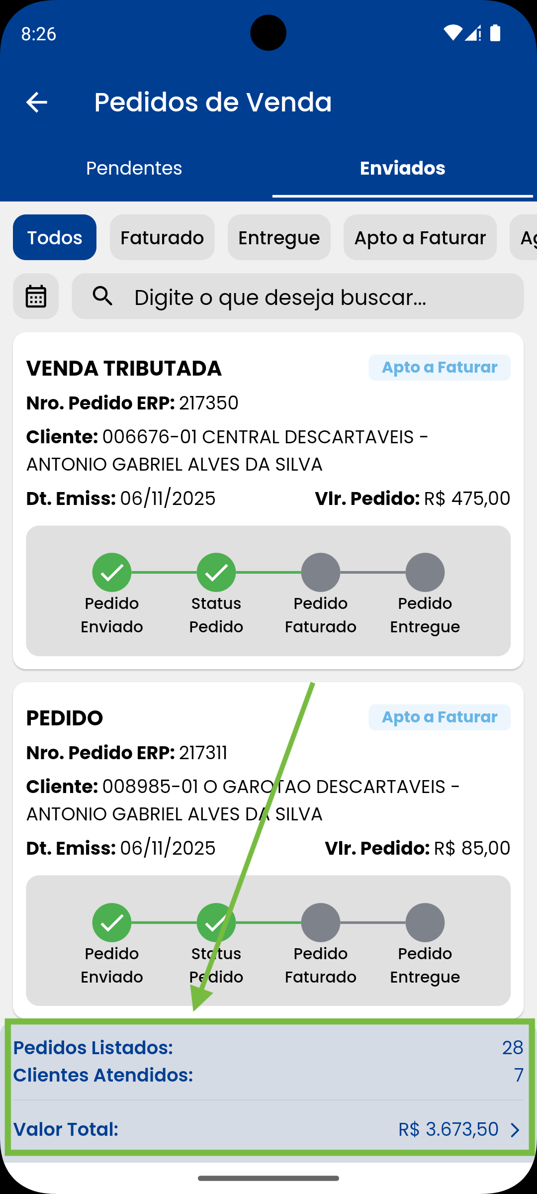 O totalizador é baseado nos pedidos que estão listados na guia, ou seja, se você aplicar algum filtro, os valores apresentados no totalizador serão alterados automaticamente.