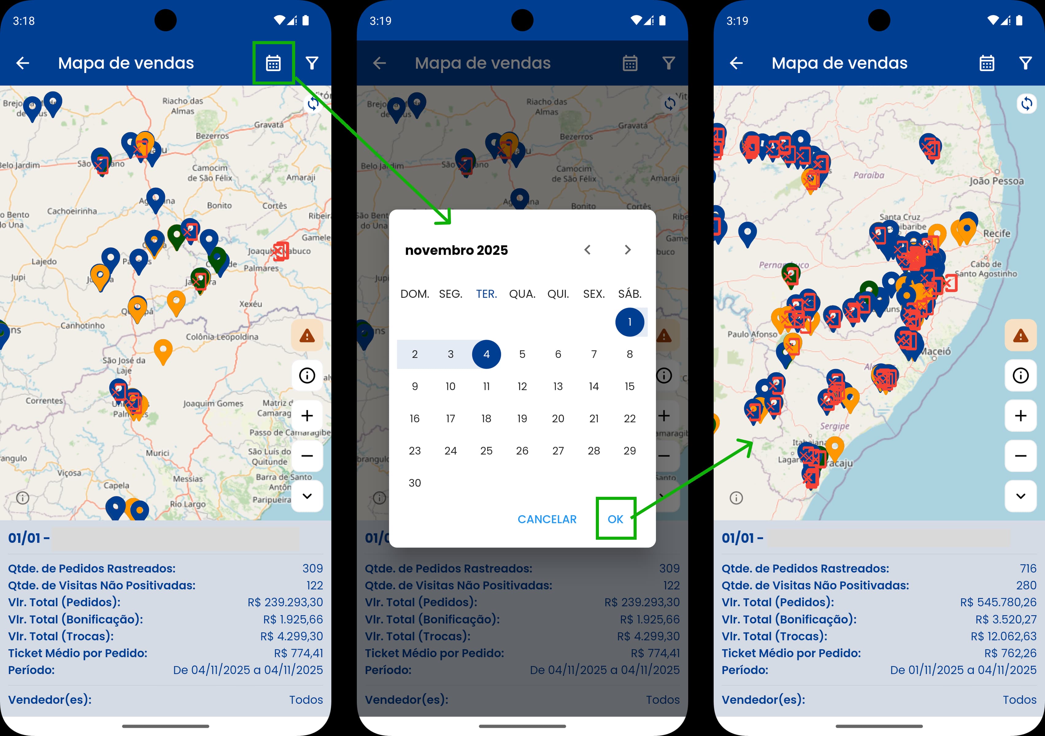 Ao abrir a tela do mapa, o padrão é que apenas os pedidos e visitas não positivadas que foram digitadas naquele mesmo dia, sejam exibidos, porém, você pode visualizar os dados de qualquer período que desejar. Para isto, basta clicar no ícone que está destacado na imagem 1, selecionar o período, e por fim, clicar em OK.