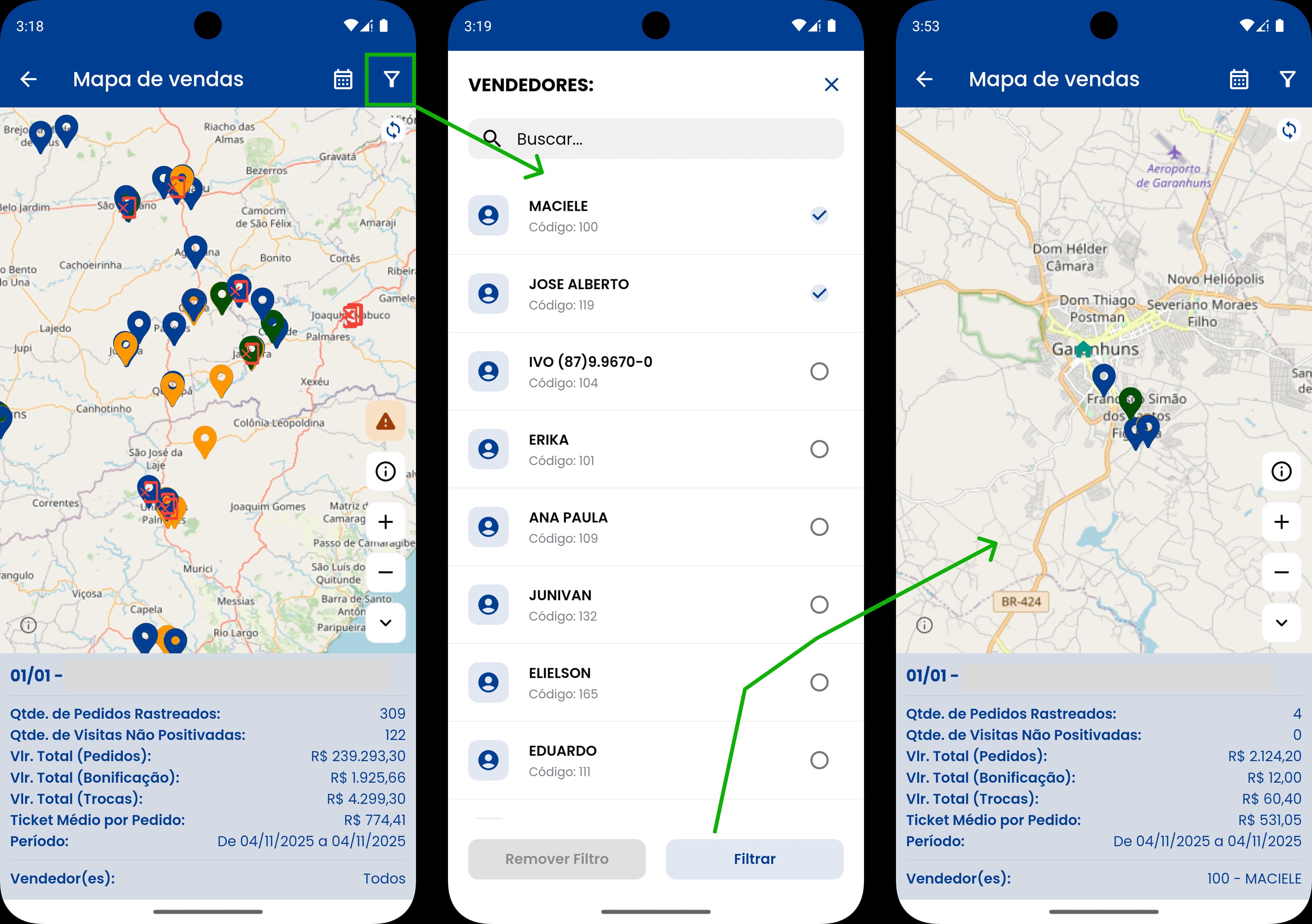 Para visualizar os dados relacionados a vendedores específicos, clique no ícone destacado na imagem 1, selecione os vendedores a qual você deseja visualizar as informações e clique no botão Filtrar (imagem 2).