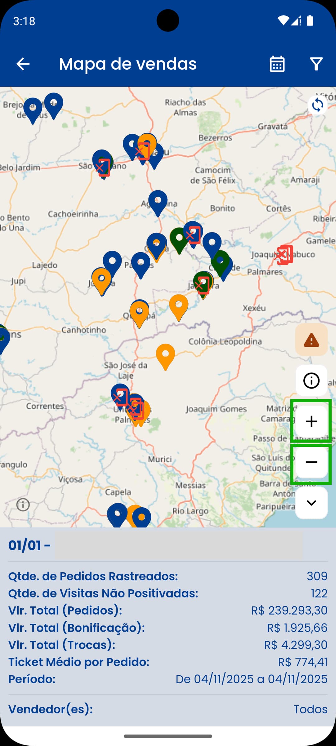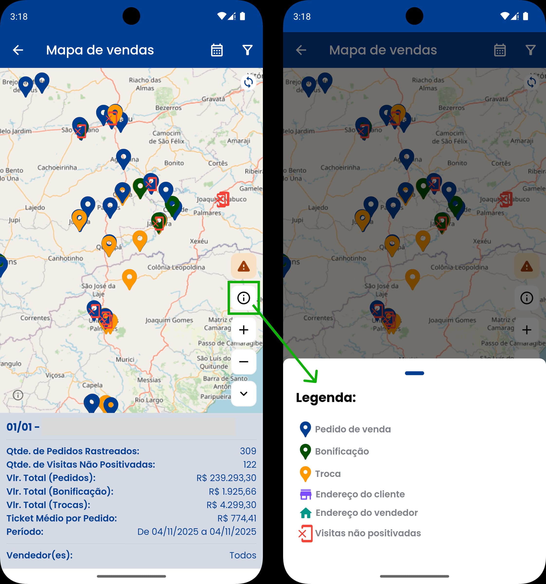 Um recurso bem interessante do aplicativo infolight é o Mapa de vendas. Esta tela permite que o usuário: