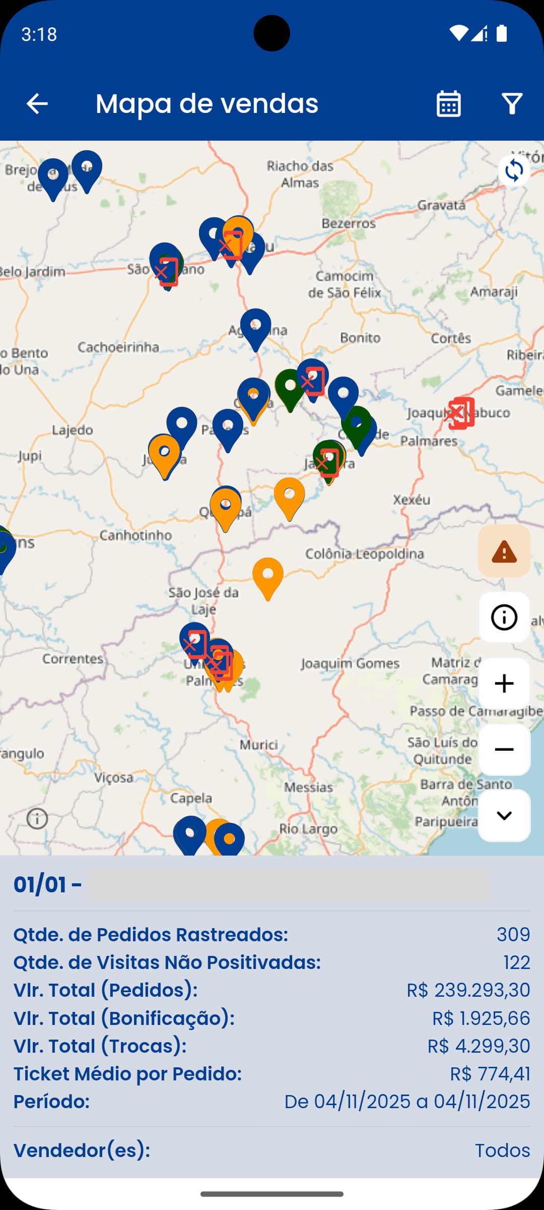 Ao filtrar os dados por vendedor, o aplicativo irá exibir todos os pedidos, visitas não positivadas e o endereço da casa do vendedor no mapa.