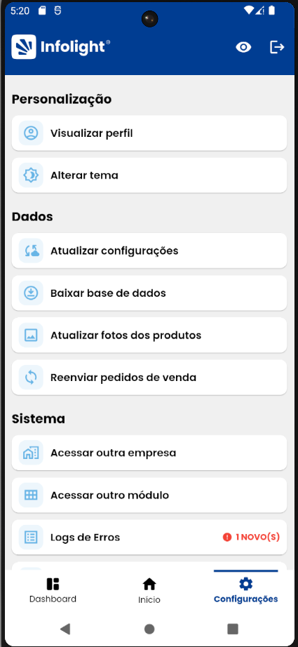 Na tela de Configuração, o usuário encontra diversas funções que permitem personalizar o sistema, corrigir eventuais inconsistências, garantir o bom funcionamento do aplicativo e gerenciar configurações e informações do sistema.