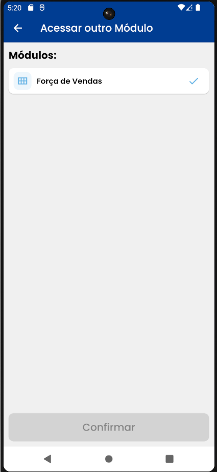 - Acessar outro módulo — Permite alternar entre os módulos disponíveis, como Força de Vendas, Expedição e Administração, conforme as permissões do usuário.