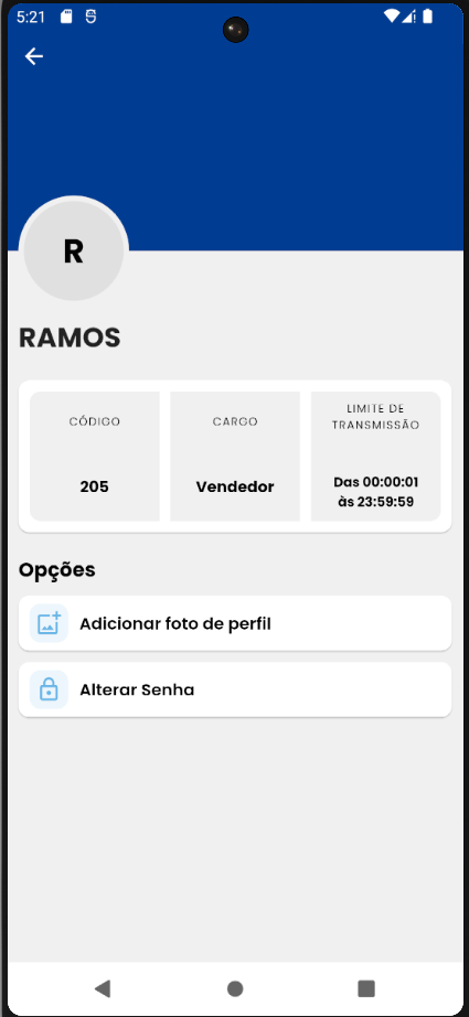Na tela de visualizar perfil, é possível visualizar informações como código do usuário, cargo e limite de transmissão.