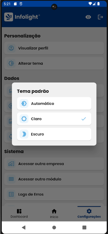 - Automático — segue o tema configurado no dispositivo (claro ou escuro).
